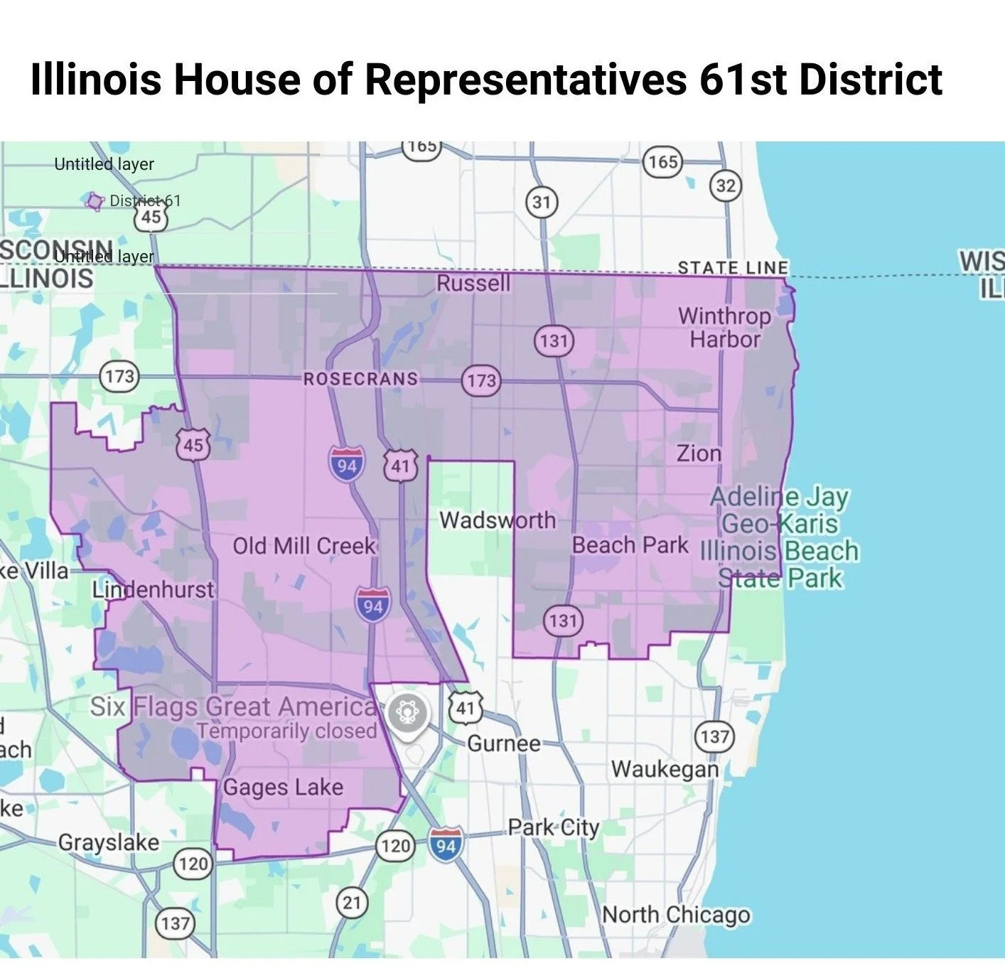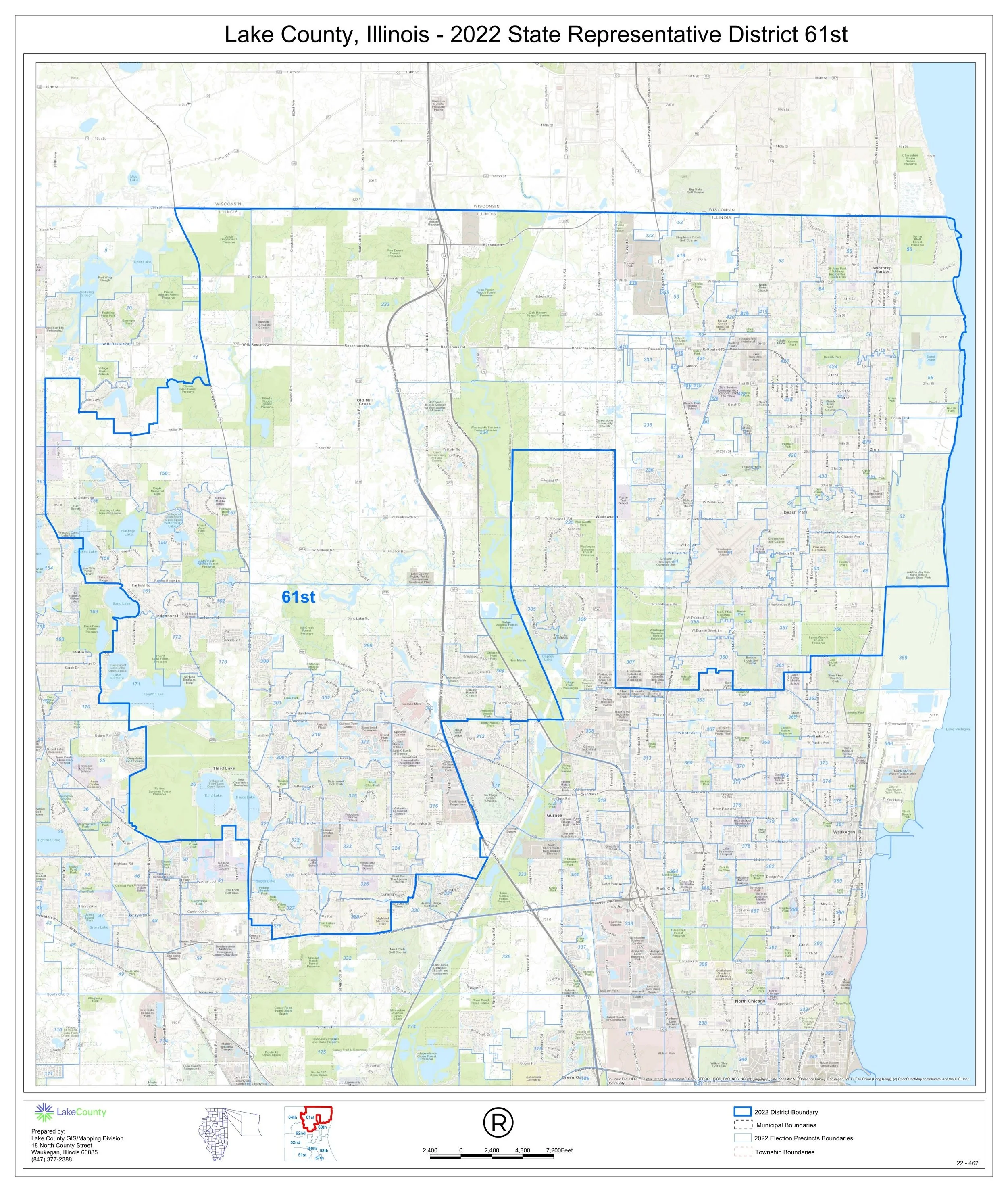 The 61st House District is located in the Northeast corner of the state of Illinois. It runs along the Wisconsin border to the north and beautiful Lake Michigan on the east. The district includes all or parts of Gurnee, Wadsworth, Old Mill Creek, Third Lake, Lindenhurst, Lake Villa, Beach Park, Grayslake, Waukegan, Winthrop Harbor, and Zion. Please see the map below, or click here to view an interactive map and see if you are in the 61st District!